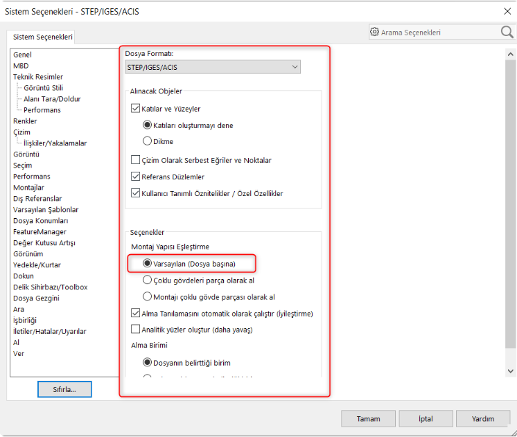 Eğer size bir STEP dosyası geldiyse ve bu gelen STEP montaj halindeyse bunu parça olarak açabilirsiniz. Normalde açtığınızda STEP dosyası içerisindeki her bir parça ayrı parçalar halinde gelecektir. Bunun nedeni varsayılan STEP dosya alma ayarlarınızdaki seçeneklerindeki montaj ayarlarınızın Varsayılan (Dosya Başına) şeklinde olmasıdır.