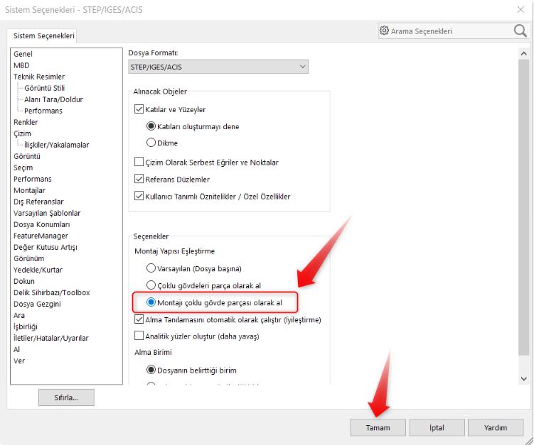 Bu ayarı Montajı Çoklu Gövde Parçası Olarak Al seçeneğini işaretleyerek değiştirirsek SOLIDWORKS, STEP olarak kaydedilmiş tüm montajları parça şablonu içerisinde açacaktır.