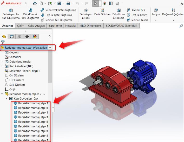 STEP olarak kaydedilmiş montaj dosyalarını SOLIDWORKS’te tek parça olarak açma ve gövdeleri altında görüntüleme yöntemi.
